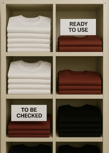 ในร้านสกรีนเสื้อ บางครั้งเสื้อบางล็อตอาจมีตำหนิหรือสีซีด ควรแยกกล่องเป็น “พร้อมใช้” กับ “ต้องตรวจสอบ” เพื่อไม่ให้หยิบเสื้อที่มีปัญหาไปใช้กับงานลูกค้า และป้องกันการสั่งซื้อซ้ำเพราะคิดว่าของหมด