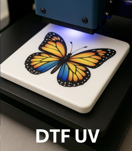 UV DTF (Ultra Violet Direct to Film) คือการต่อยอดจาก DTF ธรรมดา โดยเป็นการพิมพ์ลายด้วยหมึก UV ลงบนฟิล์มพิเศษ จากนั้นเคลือบด้วยกาวและฟิล์มลอก (Laminating Film) เพื่อให้ได้ “สติกเกอร์ลอกลาย” ที่สามารถติดบนพื้นผิววัสดุแข็งได้เกือบทุกชนิด